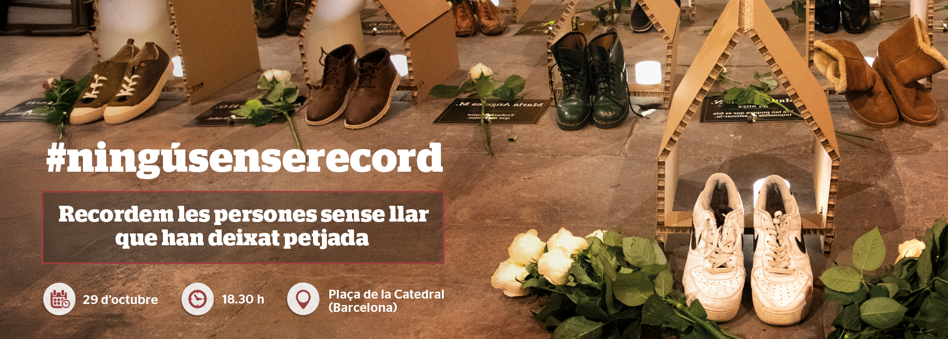 Com cada any, organitzarem l’acte amb una vintena d’entitats barcelonines el 29 d’octubre a la plaça Nova de Barcelona, davant de la Catedral, a les 18.30 h. Comptarem amb la música en directe del Conservatori del Liceu i el cor de gòspel d’El Lloc de la Dona; recordarem les persones que ens han deixat una per una, llegint unes paraules. Per acabar de fer simbòlic aquest missatge de record, omplirem la plaça de cases de cartó, un gest que vol representar les llars que no van tenir.