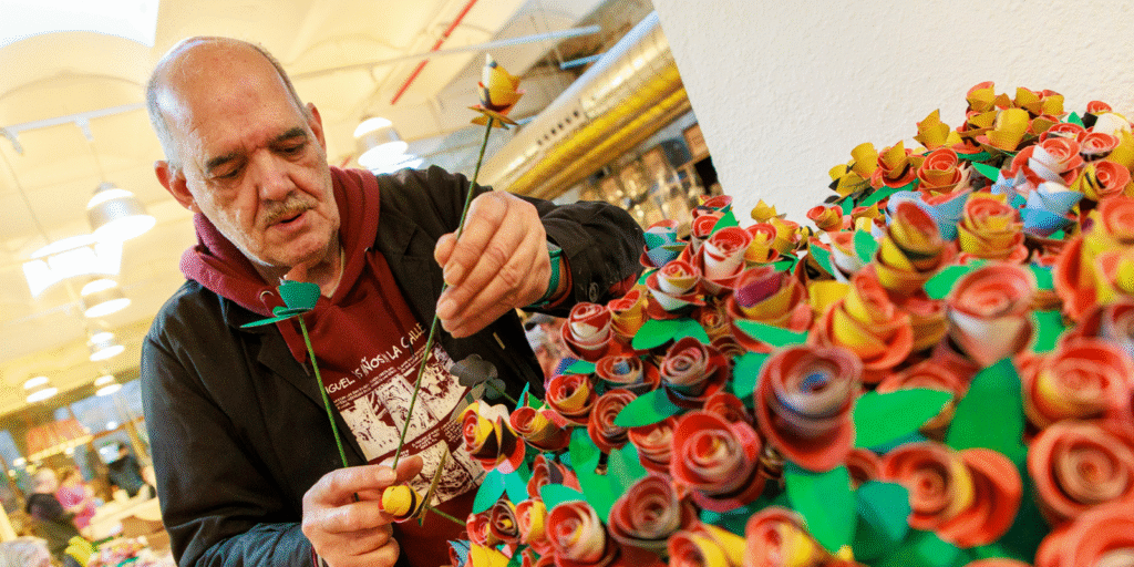 En el taller de Arrels, hace semanas que trabajamos para tenerlo todo a punto. Rosas, puntos de libro y otros detalles artesanales toman forma, elaborados por las personas que acompañamos. Para Sant Jordi, pondremos paradas con nuestros productos y también organizamos actividades de sensibilización. Te invitamos a participar y a hacer posible #UnaRosaParaUnHogar.