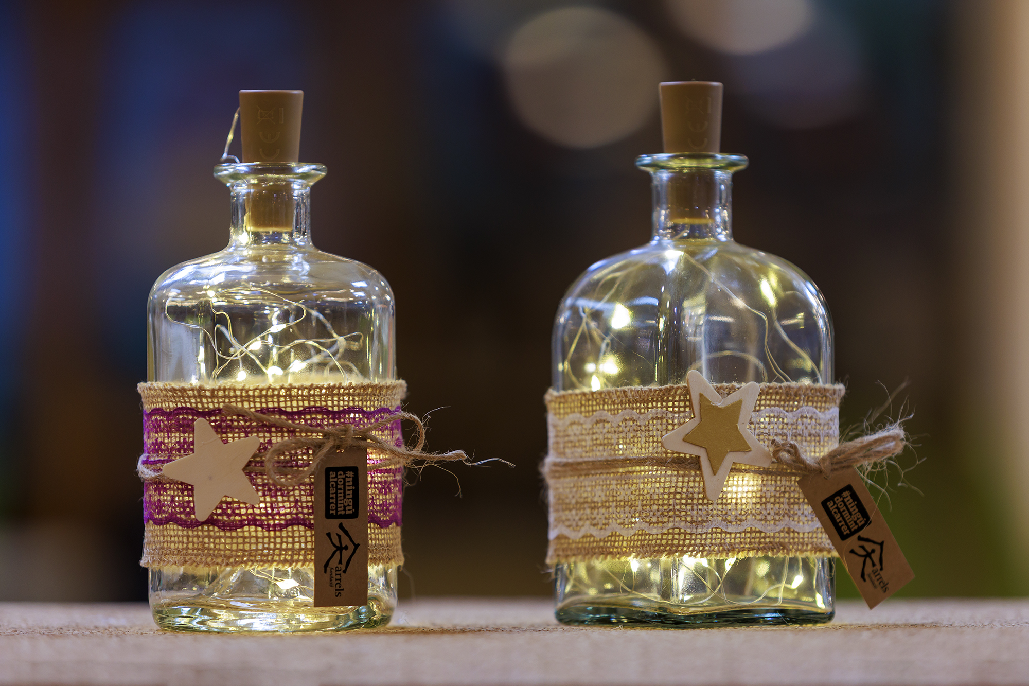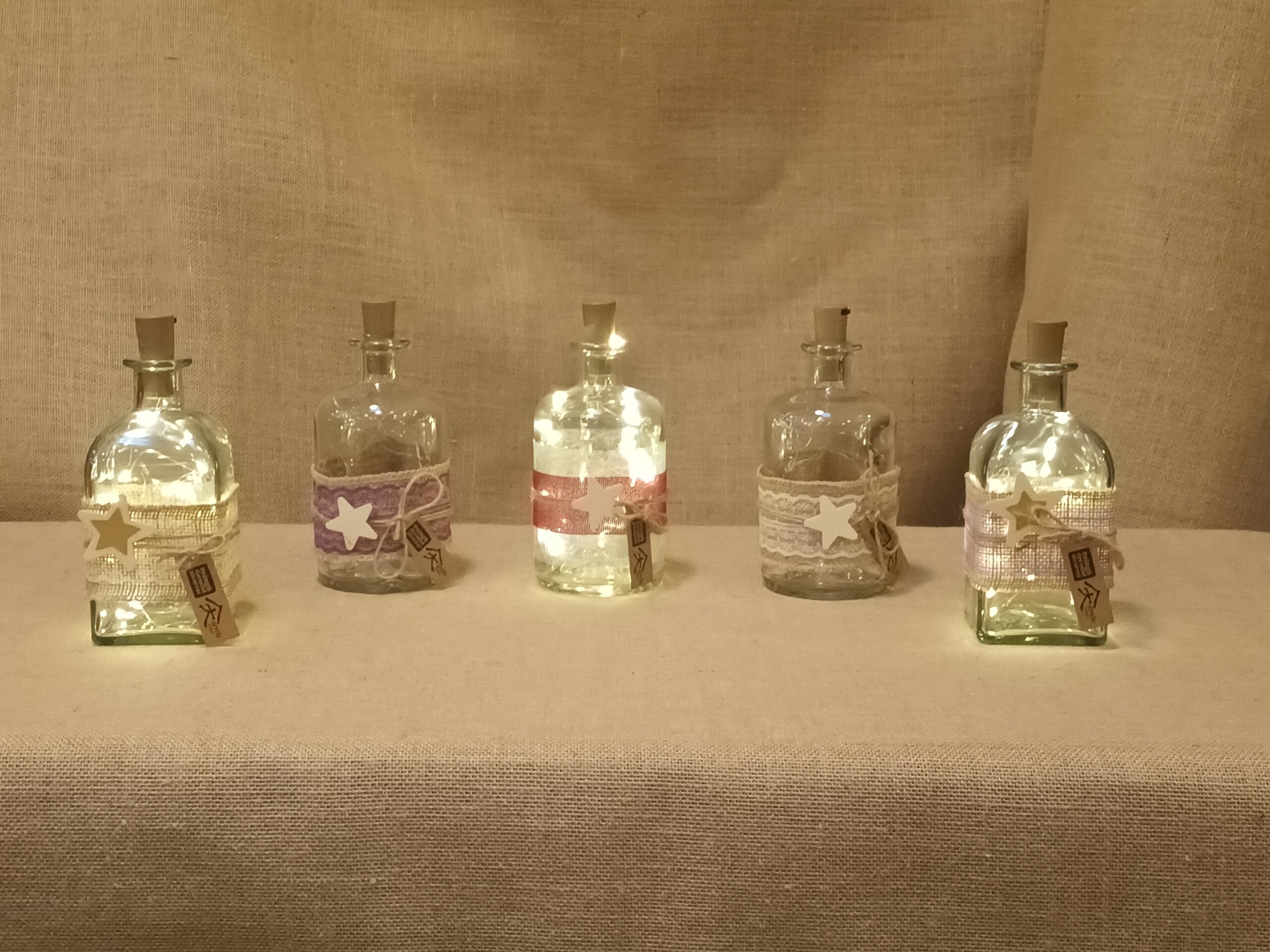 Aquesta ampolla és un objecte decoratiu que aportarà llum i calidesa a la teva llar, ideal per crear un racó acollidor o per regalar a algú especial. Està decorada amb una banda de tela rústica, una garlanda de llums LED a l’interior i acabada amb un estel de fusta. úniques i originals, com les persones sense llar que les han creat. N’hi ha de 3 colors diferents (blanc, lila i grana) i s’enviaran aleatòriament (en cas que vulguis triar el color, et convidem a venir a la botiga d’Arrels – c/ Ample, 3. Barcelona-).