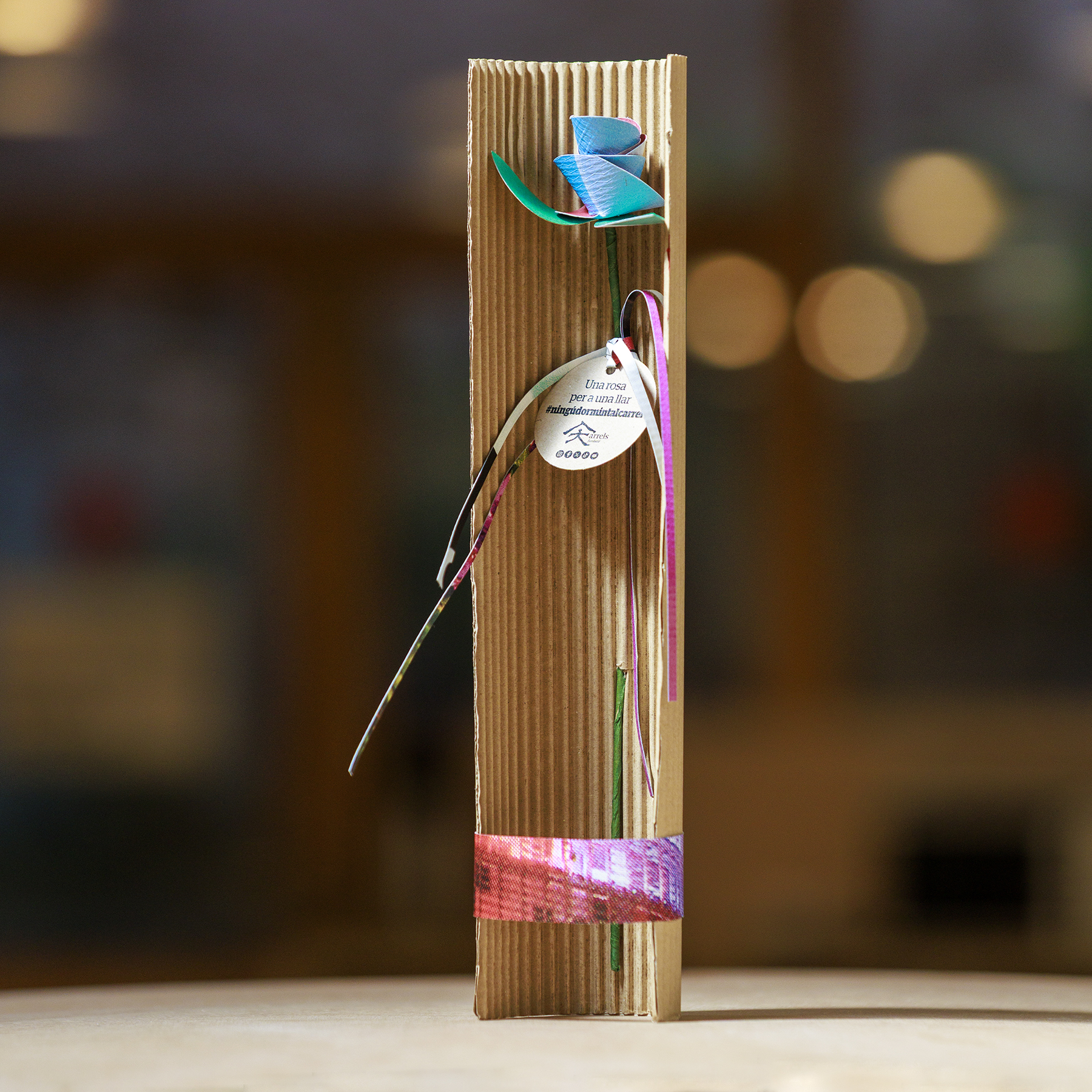 Està presentada en suport de cartró. La tija s’acompanya d’una etiqueta amb el missatge ‘Una rosa per a una llar’, darrere hi trobareu un codi QR que us porta al vídeo de com s´han fet aquestes roses https://youtu.be/Xz8JOpFIfhs