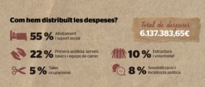 El total de despeses de l’any ha estat de 6.137.383,65 euros. El 82% s’ha invertit en atendre directament les persones sense llar, especialment en cobrir necessitats d’allotjament i suport social (55%), en serveis de primera acollida que oferim a través del centre obert i els equips de carrer (22%) i al taller ocupacional (5%).